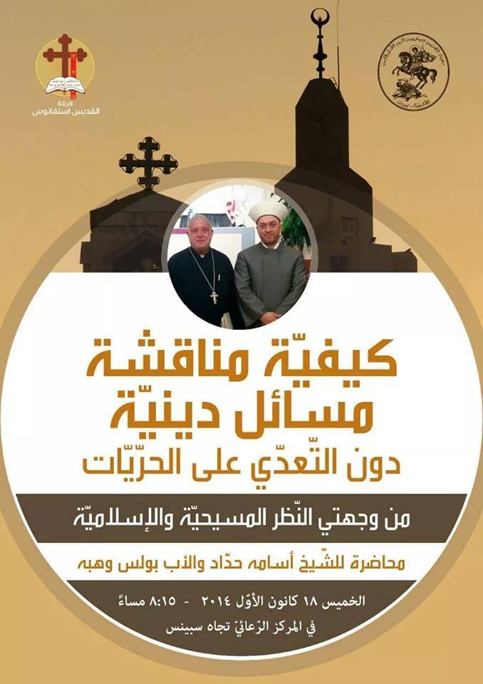 دعت فرقة القديس استفانوس لمحاضرة بعنوان "كيفية مناقشة مسائل دينية دون التعدي على الحريات" ألقاها فضيلة الشيخ أسامة حداد والمتقدم في الكهنة بولس وهبة، وقد حضرها كهنة الرعية والمسؤولين ومن شاء من أبناء الرعية.